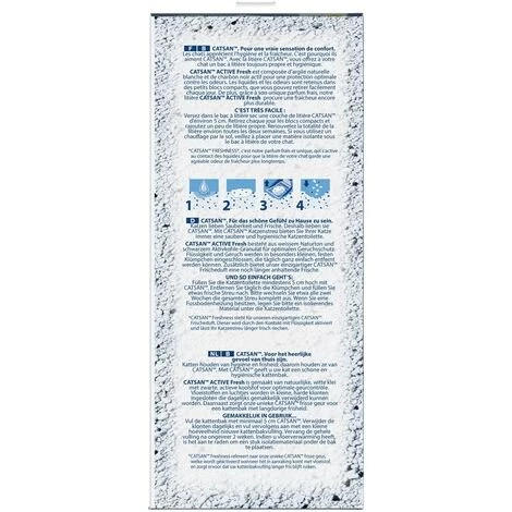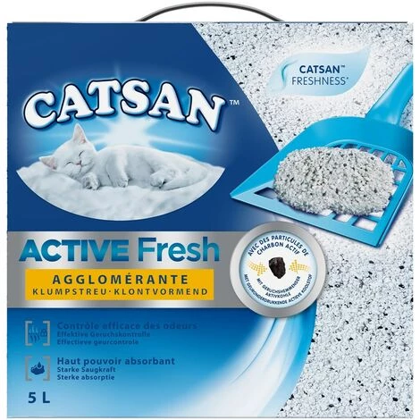 Composée d’argile naturelle blache et de charbon noir actif pour une protection optimales contre les odeurs. Les liquides et les odeurs sont retenus dans des petits blocs compacts, que vous pouvez retirer facilement chaque jour. De plus, grâce à son unique parfum frais, la litière Catsan ACTIVE Fresh procure une fraîcheur encore plus durable.