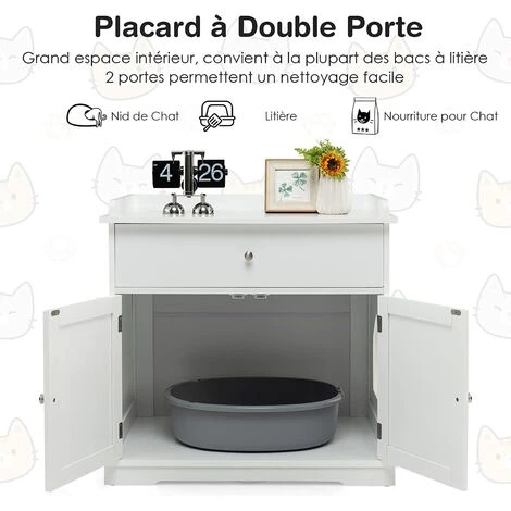 - Notre meuble delitière pour chat est conçu avec un tiroir coulissant pour ranger les objets àl’abri de la poussière et un grand plateau avec des garde-corps pour exposerles décorations et ranger les objets à portée de main. Et dans le grandintérieur de meuble on peut placer une litière pour chat, un coussin chat ou de la nourriture pour chat. Il peutnon seulement être un espace pratique pour la litière pour chat, mais peutégalement être utilisé comme table d’appoint, apportant de la commodité à votrevie quotidienne. L’enceinte cachée du bac à litière peut réduire efficacementla quantité de litière que votre chat sort du bac à litière tout en retenanttoutes les odeurs à l’intérieur.