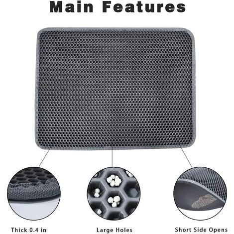 Couche hydrofuge – le tapis du bac à litière est à deux couches. La couche inférieure imperméable est faite de caoutchouc mousse EVA léger, durable et non toxique, ce qui permet de garder le sol au sec à tout moment. Il est léger et antidérapant.